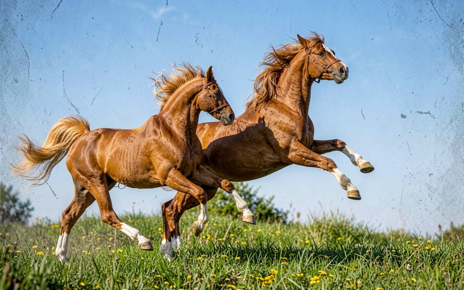 Две рыжие лошади бегущие по зеленому лугу