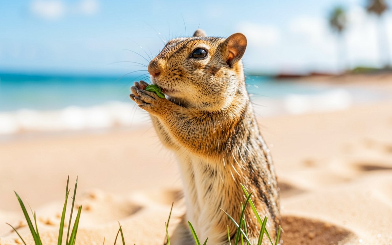 Рыжий бурундук на песчаном пляже у океана