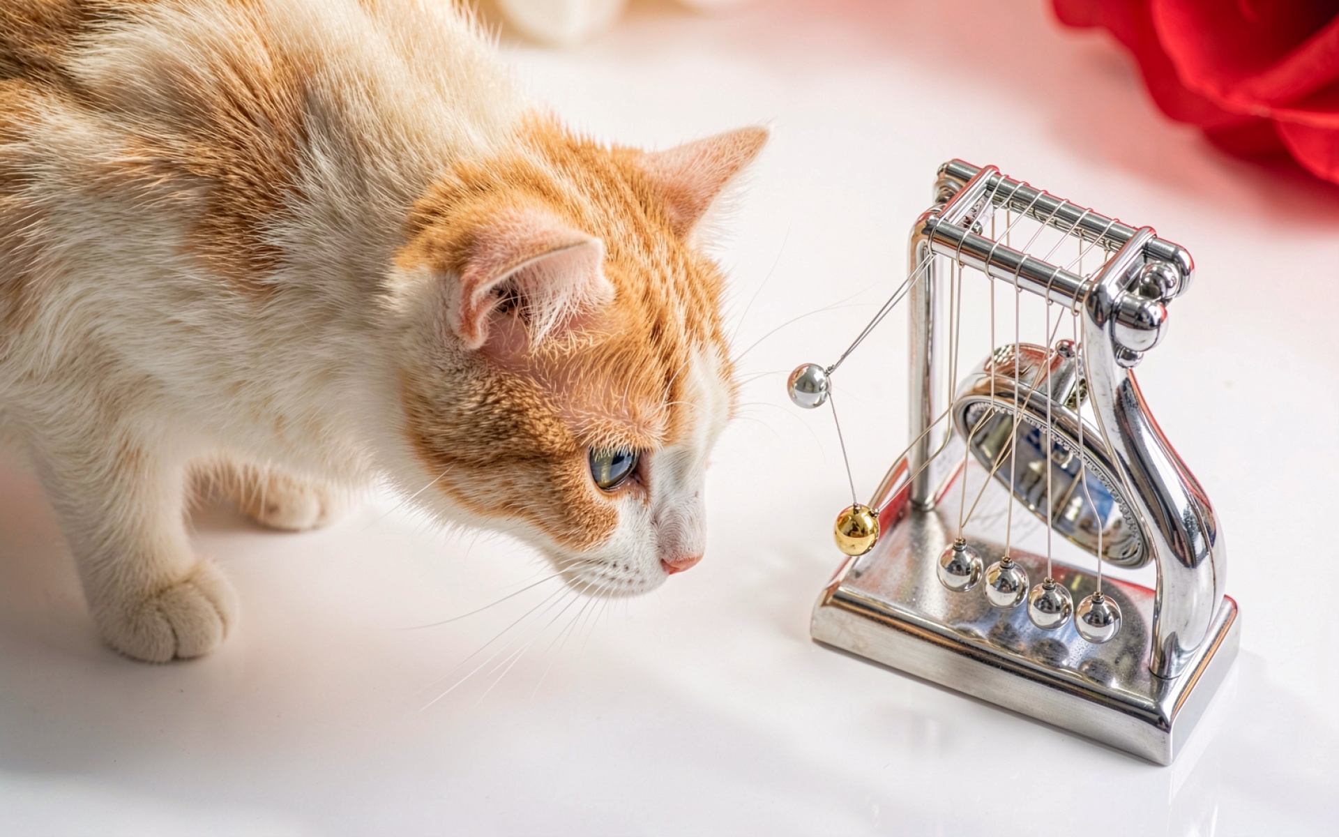 Рыжий кот изучает стальной колыбель Ньютона