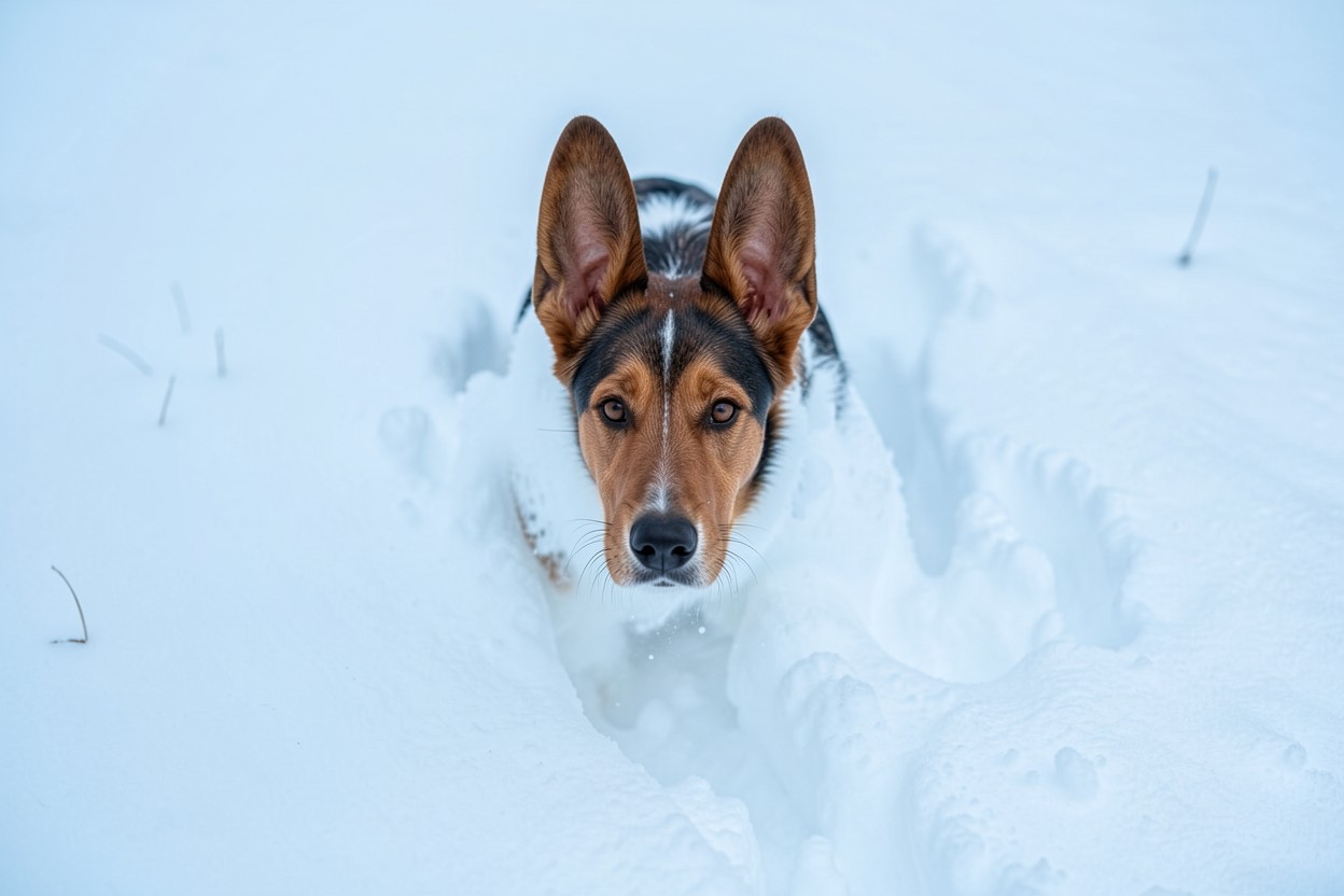Рыжий пес в глубоком белом снегу