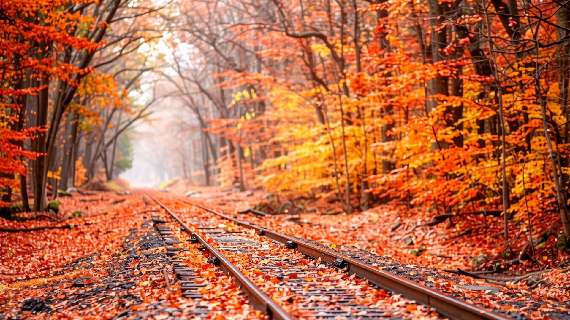 Железнодорожные пути в осеннем лесу с рыжими листьями