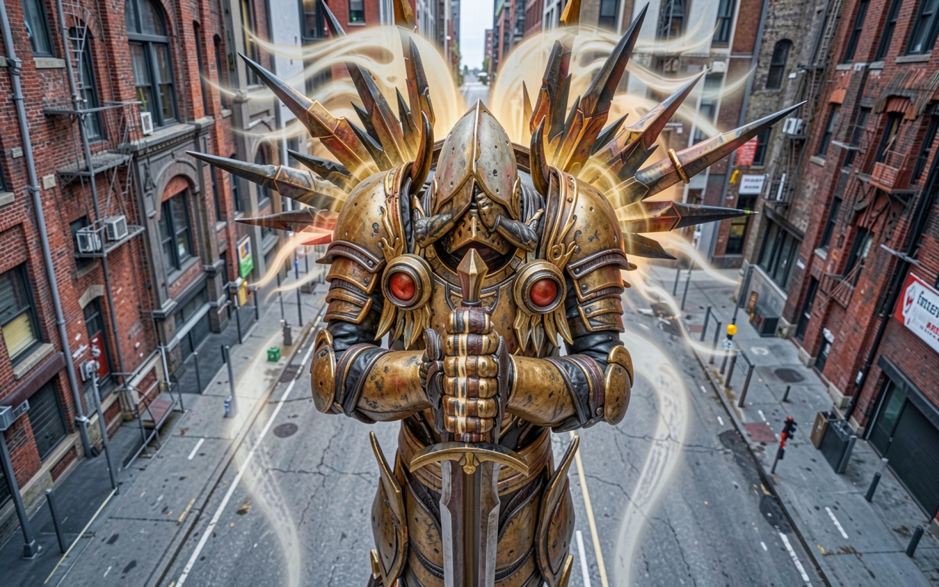 Рыцарь в золотых доспехах на городской улице