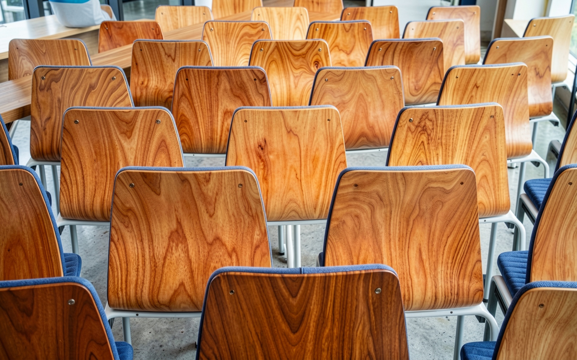 Ряды деревянных стульев в современном светлом интерьере