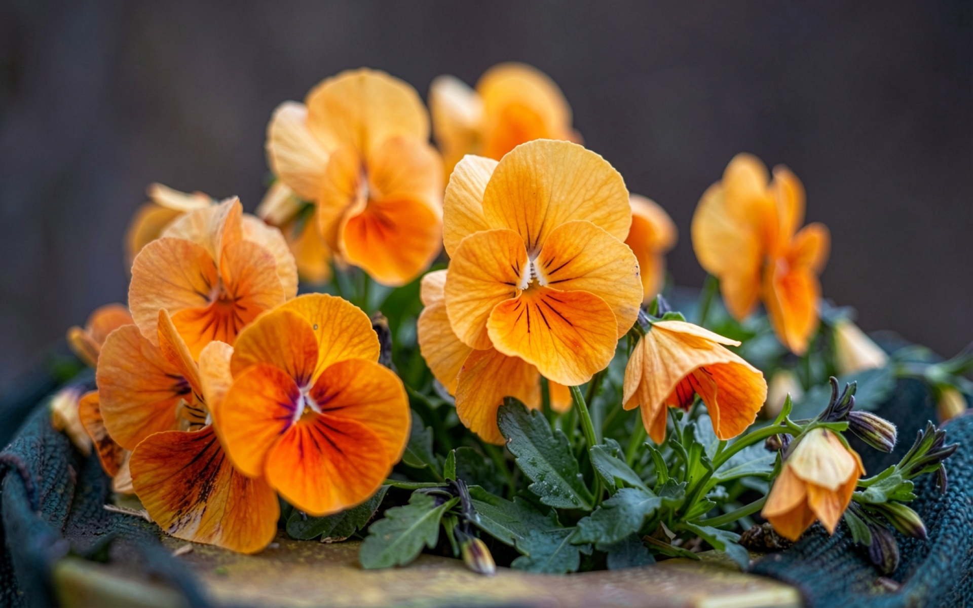 Оранжевые цветы виолы в темном садовом горшке