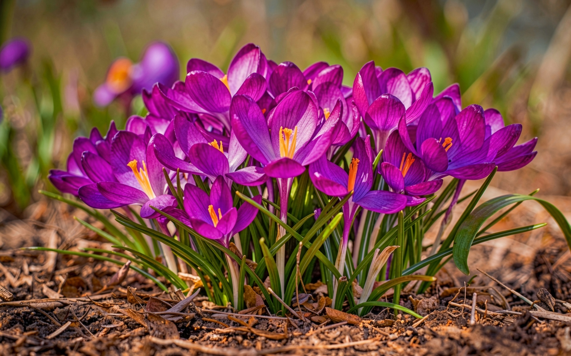 Фиолетовые крокусы в весеннем садовом грунте