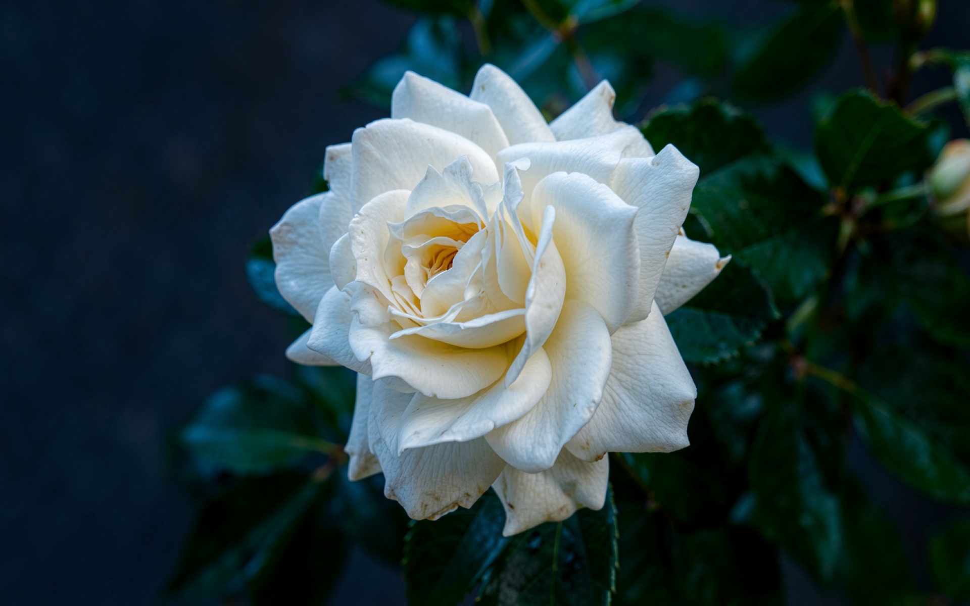 Белая роза в темном саду ночью