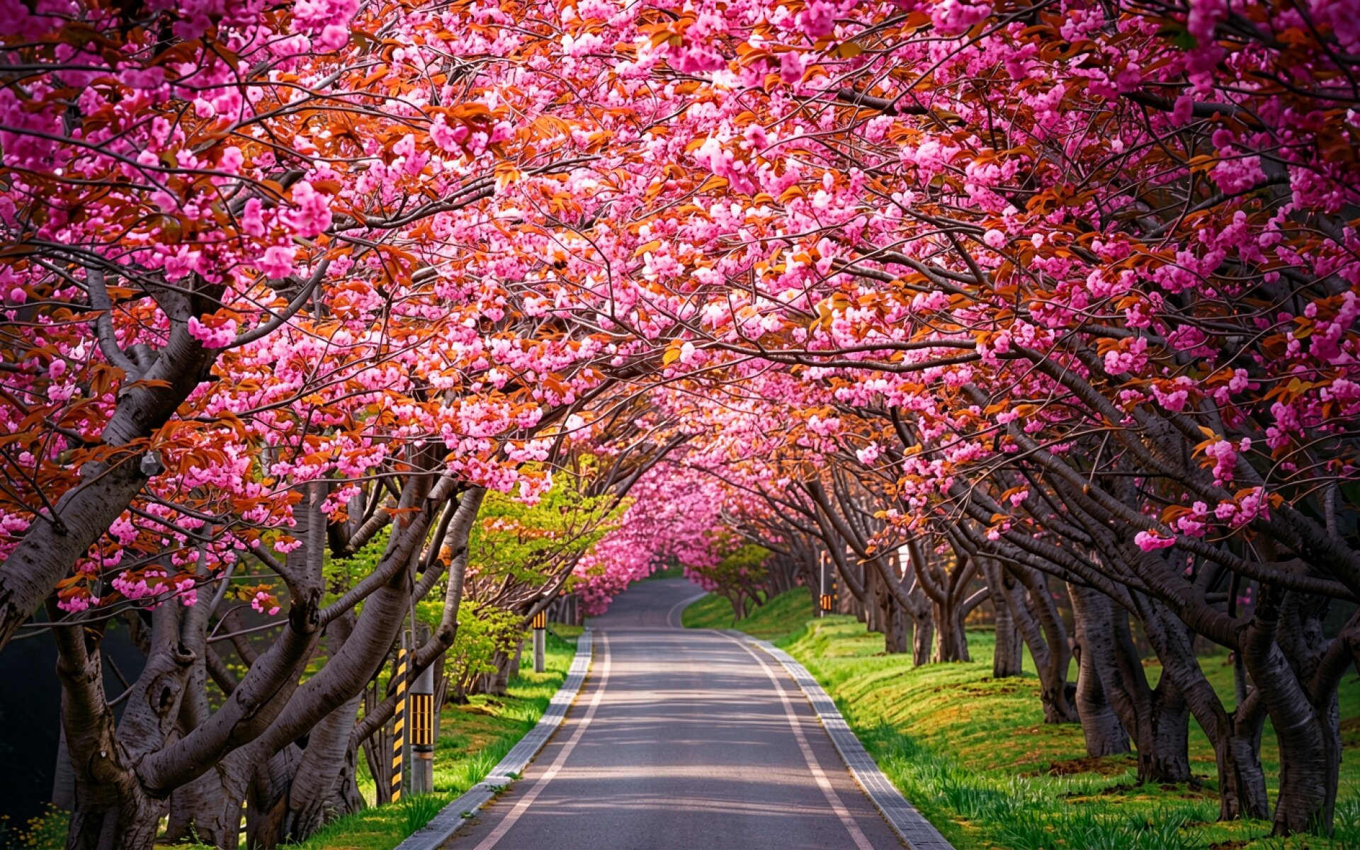 Цветущая сакура вдоль пустой асфальтированной дороги
