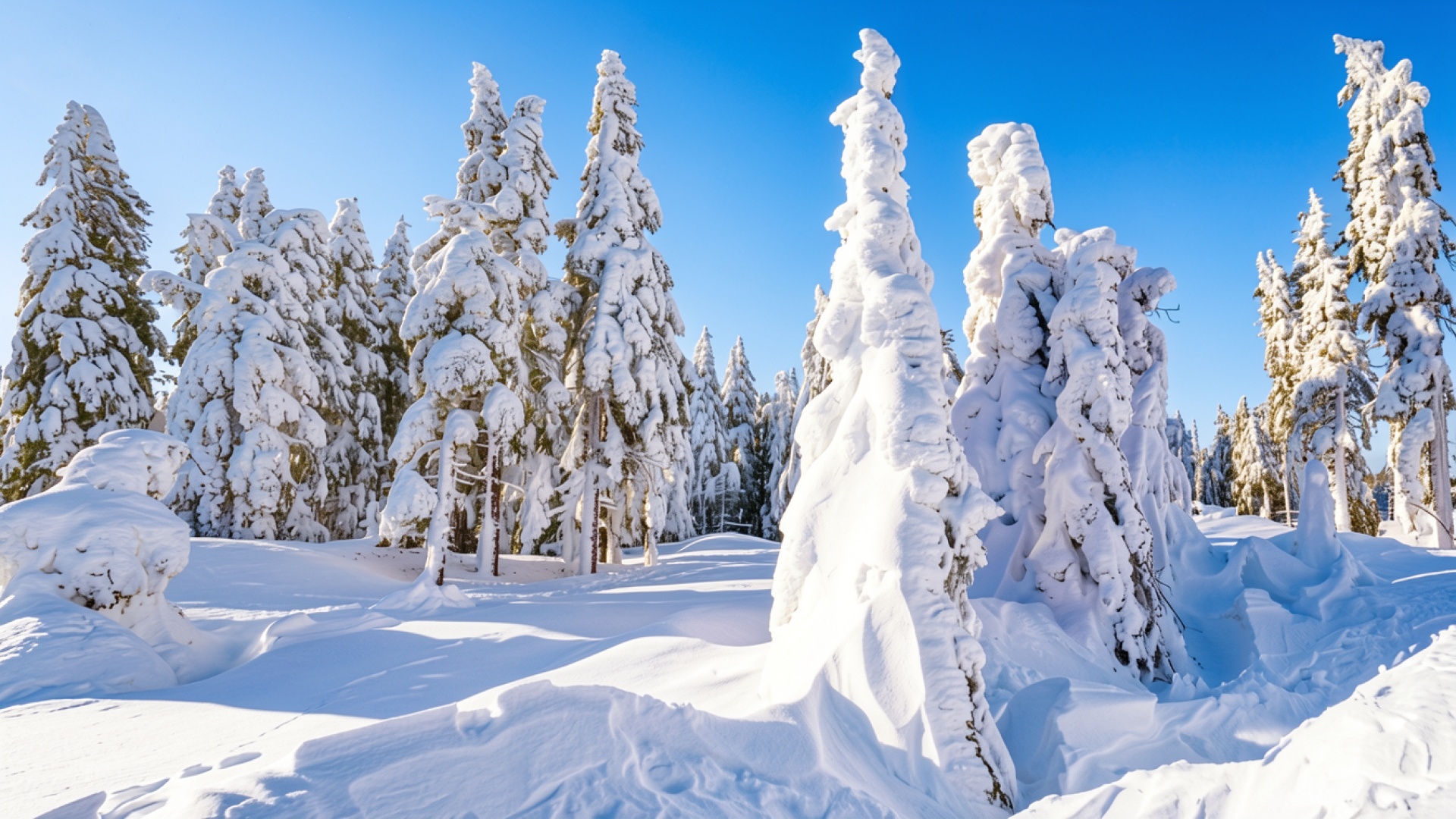 Заснеженные ели в зимнем лесу при солнечном свете