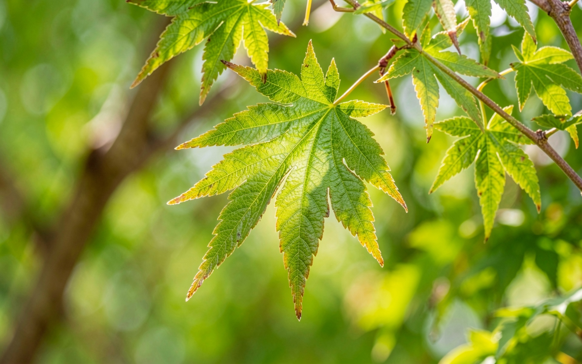 Зеленый лист клена в солнечном свете