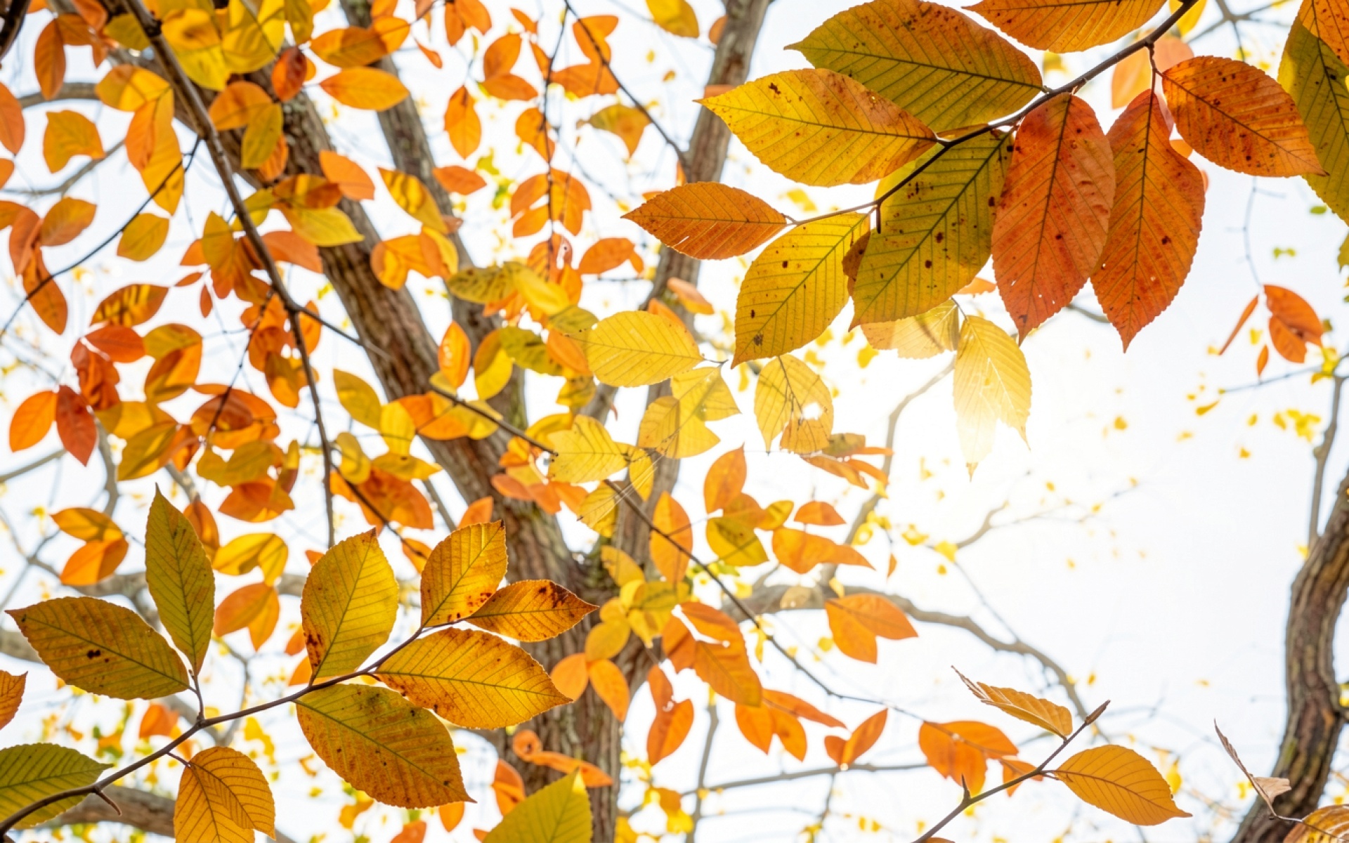 Осенние желтые листья на фоне светлого неба
