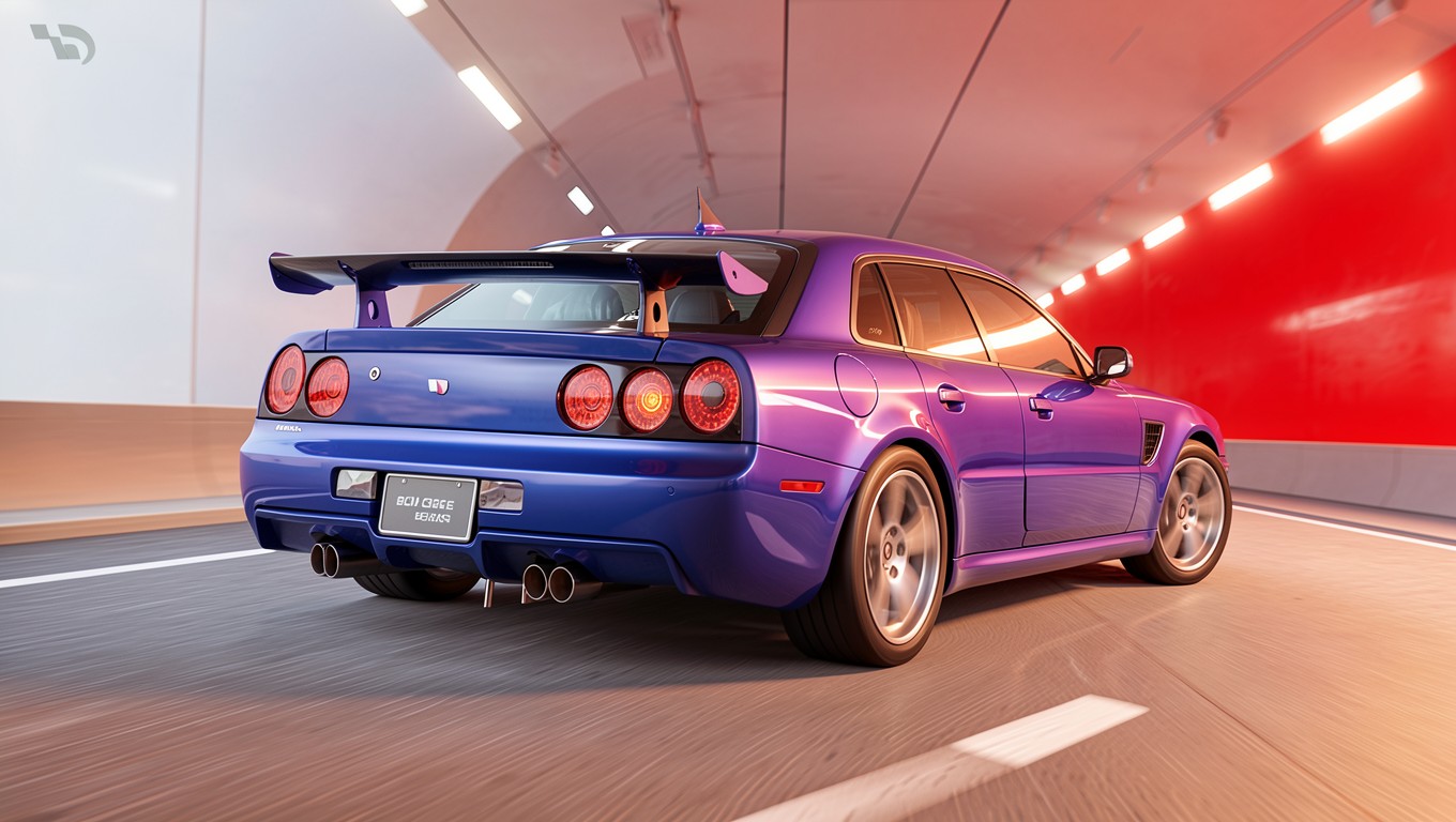 Синий автомобиль Nissan Skyline в светлом тоннеле