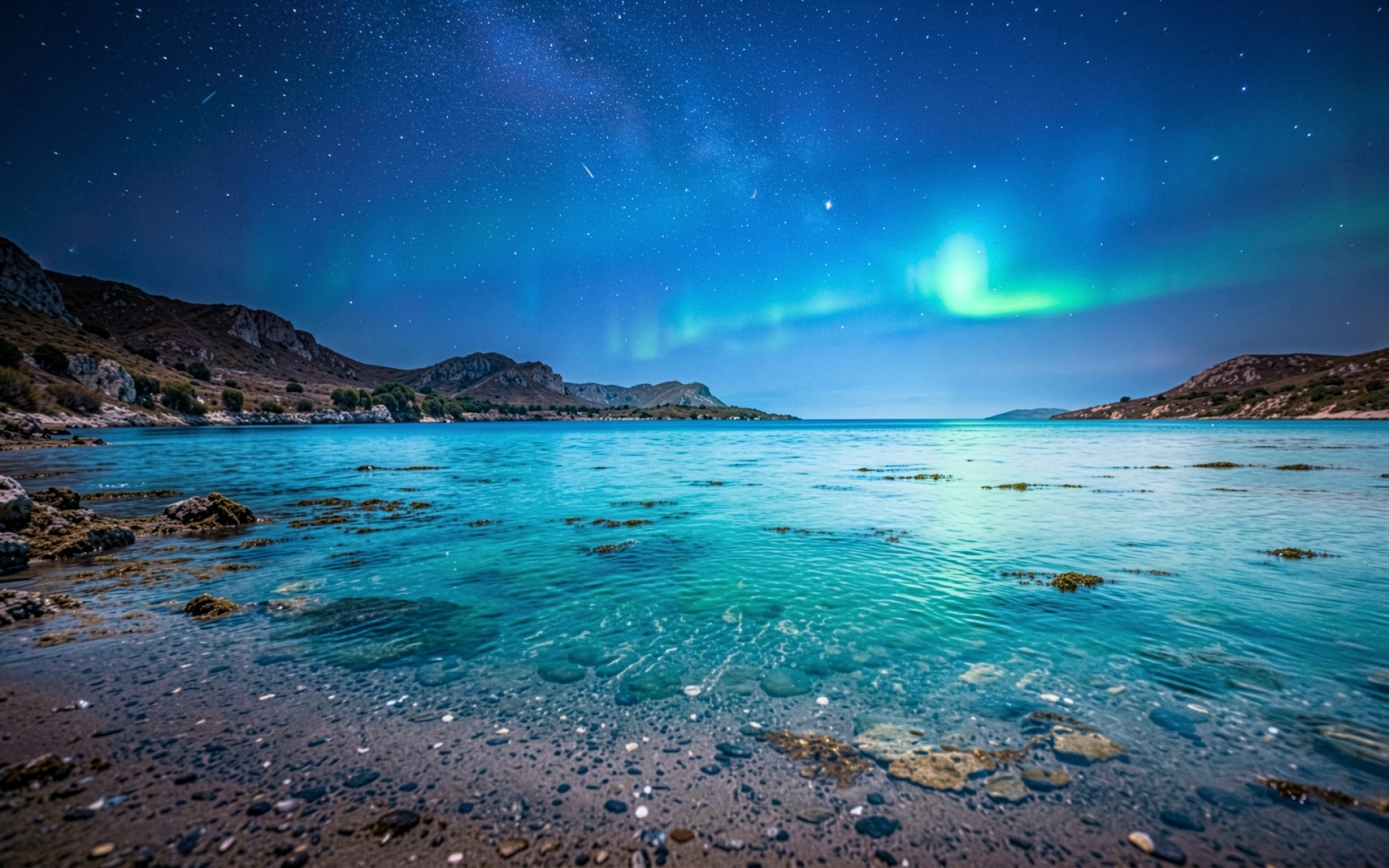 Северное сияние над бирюзовым ночным морем