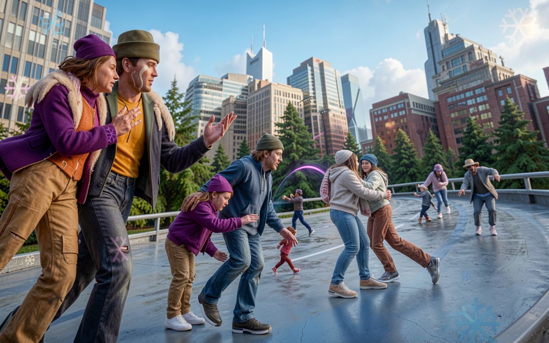 Семья в зимних одеждах на городской площади