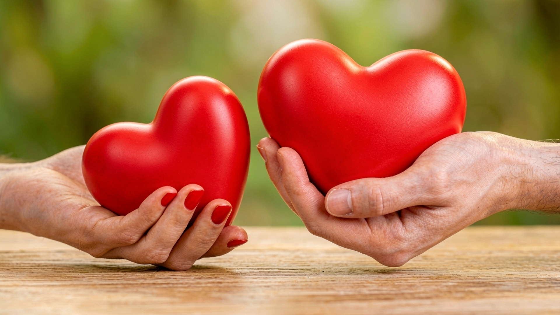 Два красных сердца в руках на столе