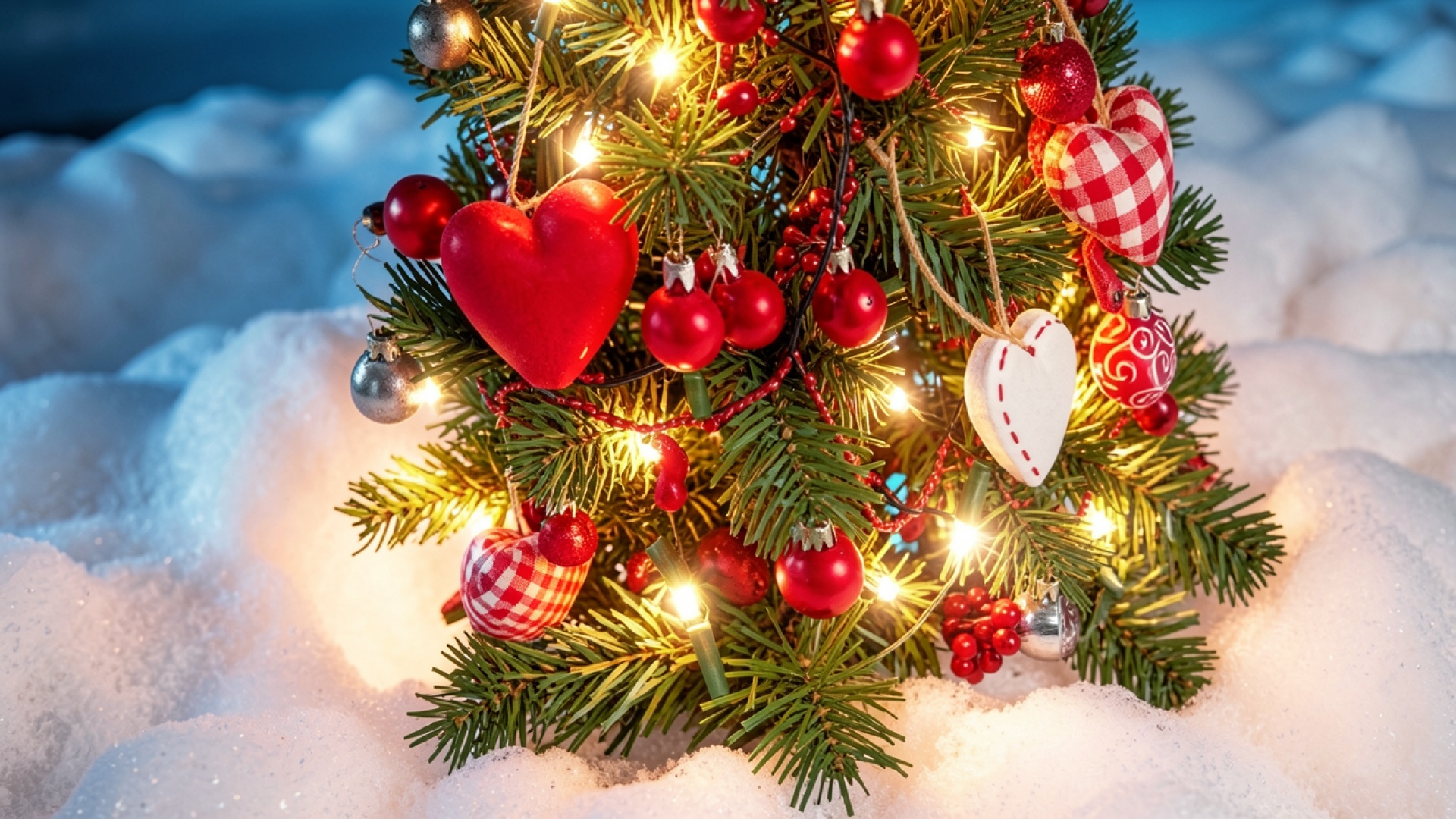 Рождественская ель с красными сердцами в снегу