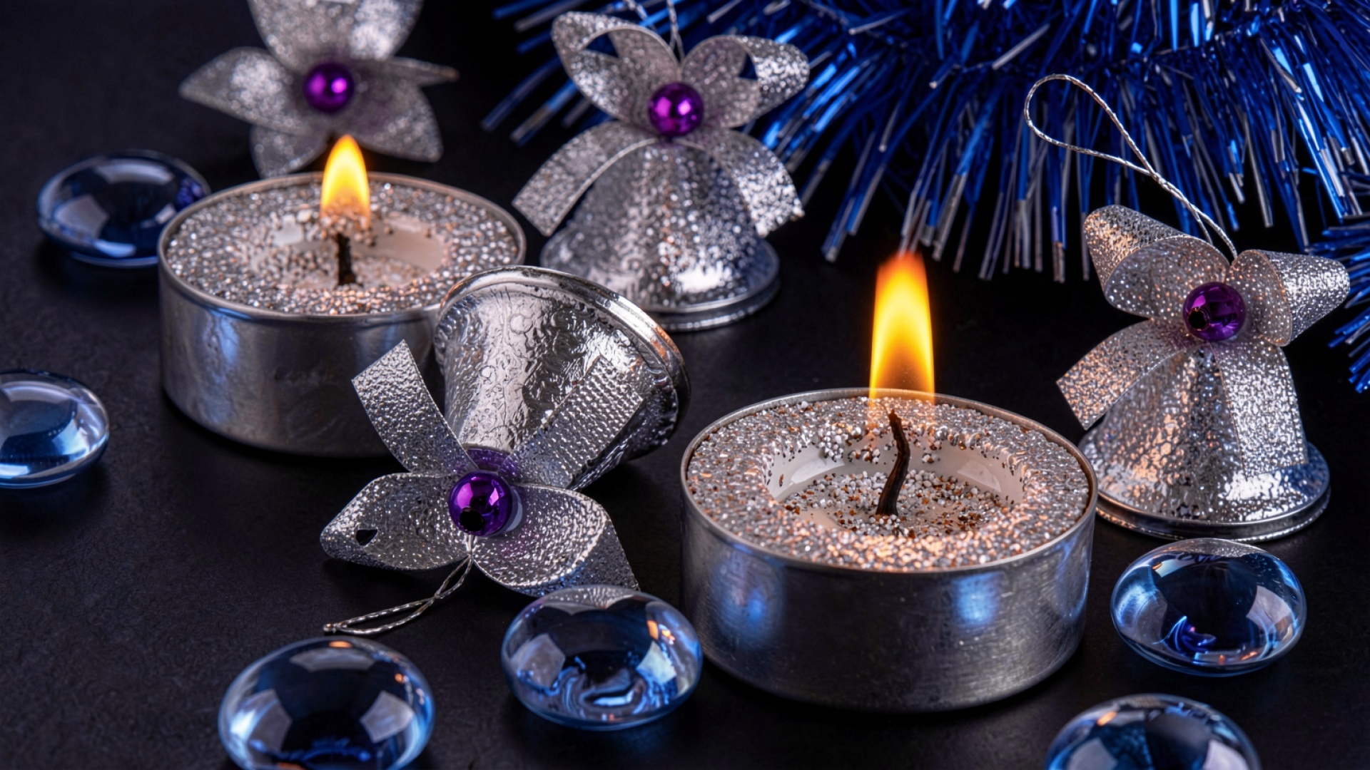 Горящие свечи и серебристые украшения на темном фоне