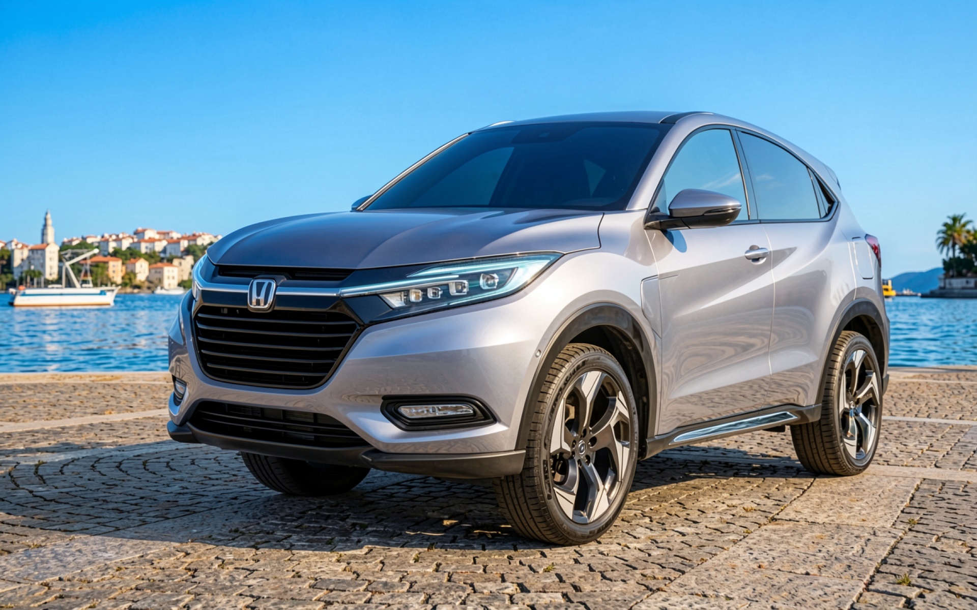 Серебристый кроссовер Honda HR-V на мощеной набережной