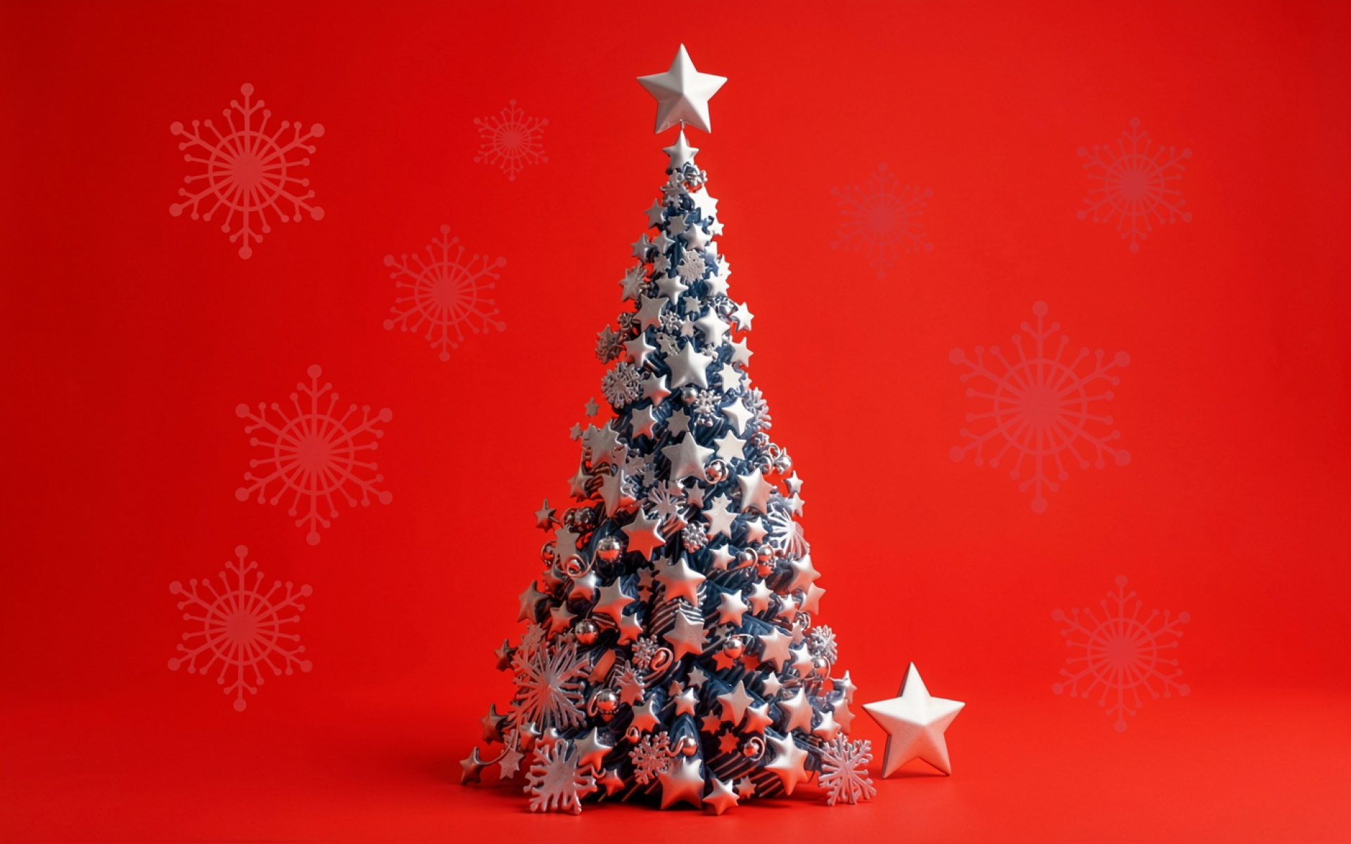 Серебряная новогодняя елка на красном фоне
