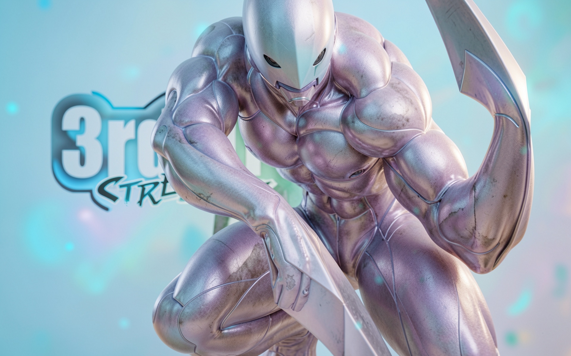 Серебряный киборг в динамичной позе на голубом фоне