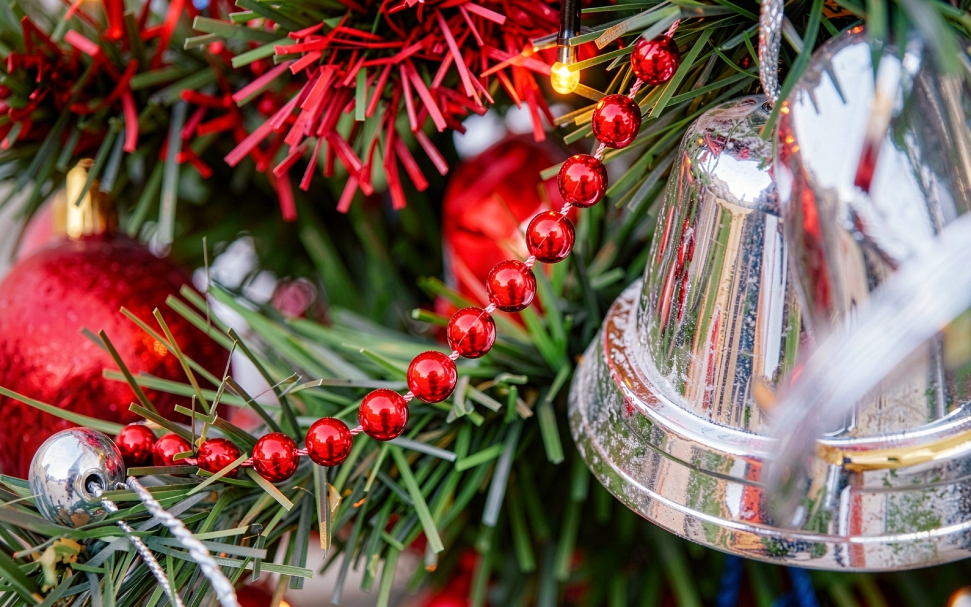 Серебряный колокольчик и красные бусы на елке