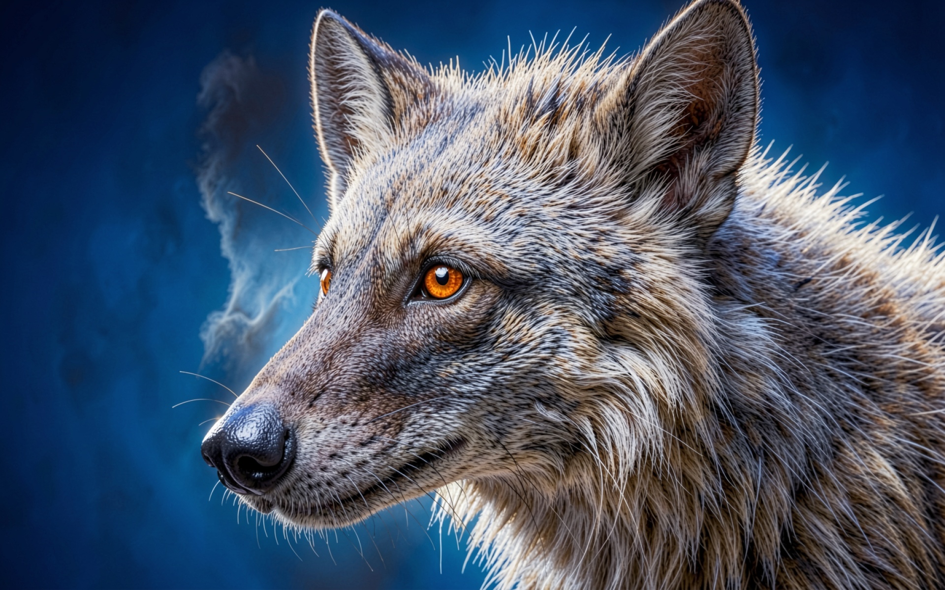 Портрет серого волка с оранжевыми глазами