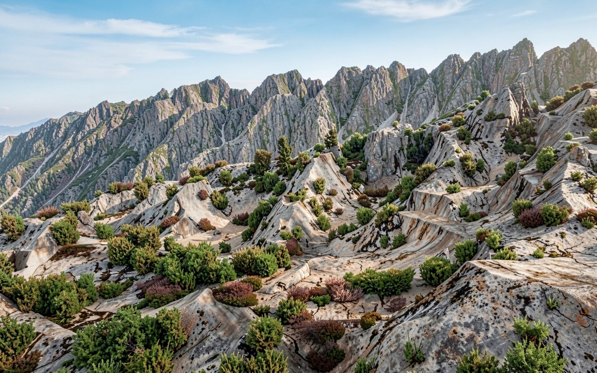 Серые скалистые горы с зелеными кустарниками