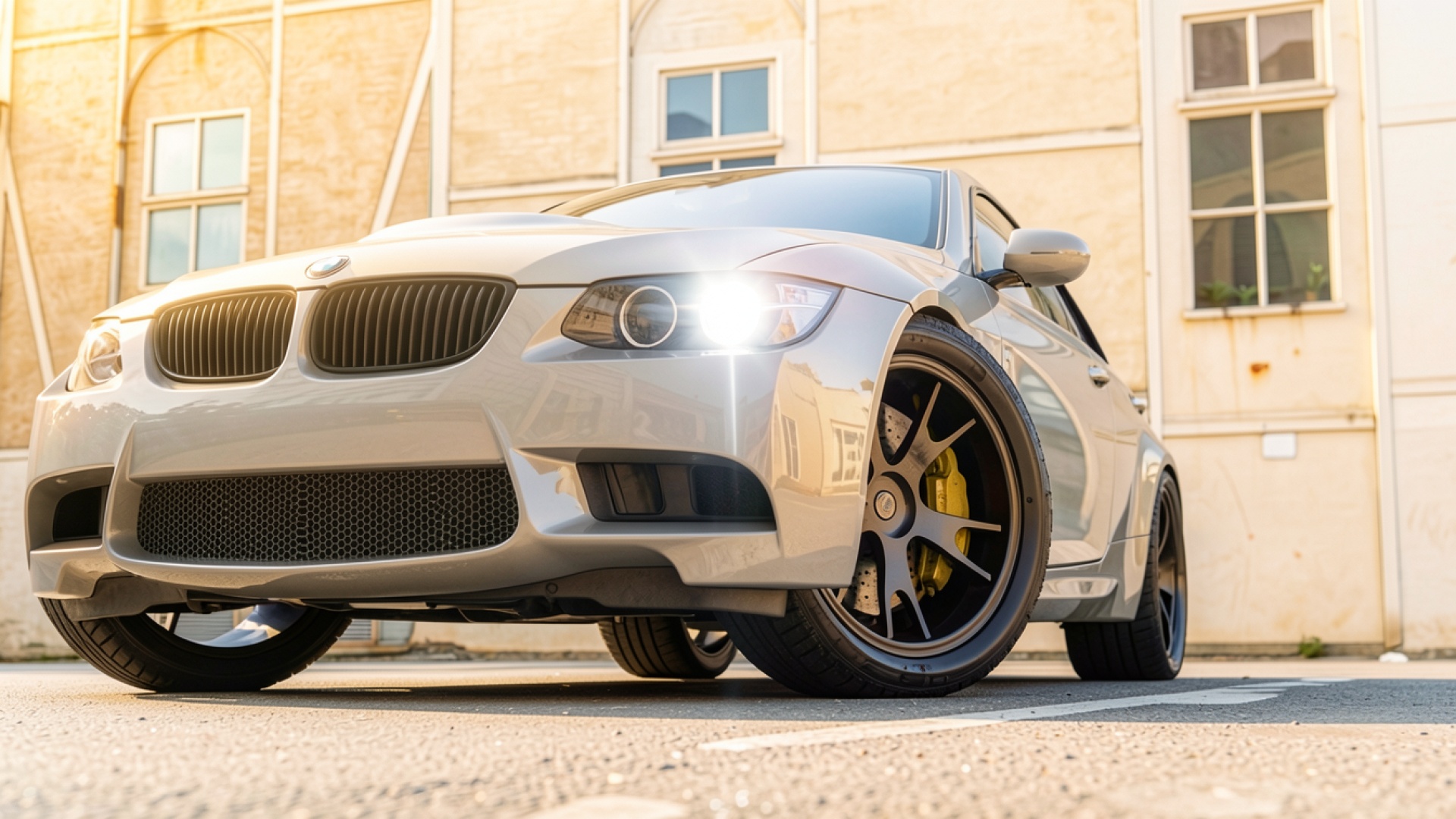 Серый BMW M3 в городском индустриальном окружении