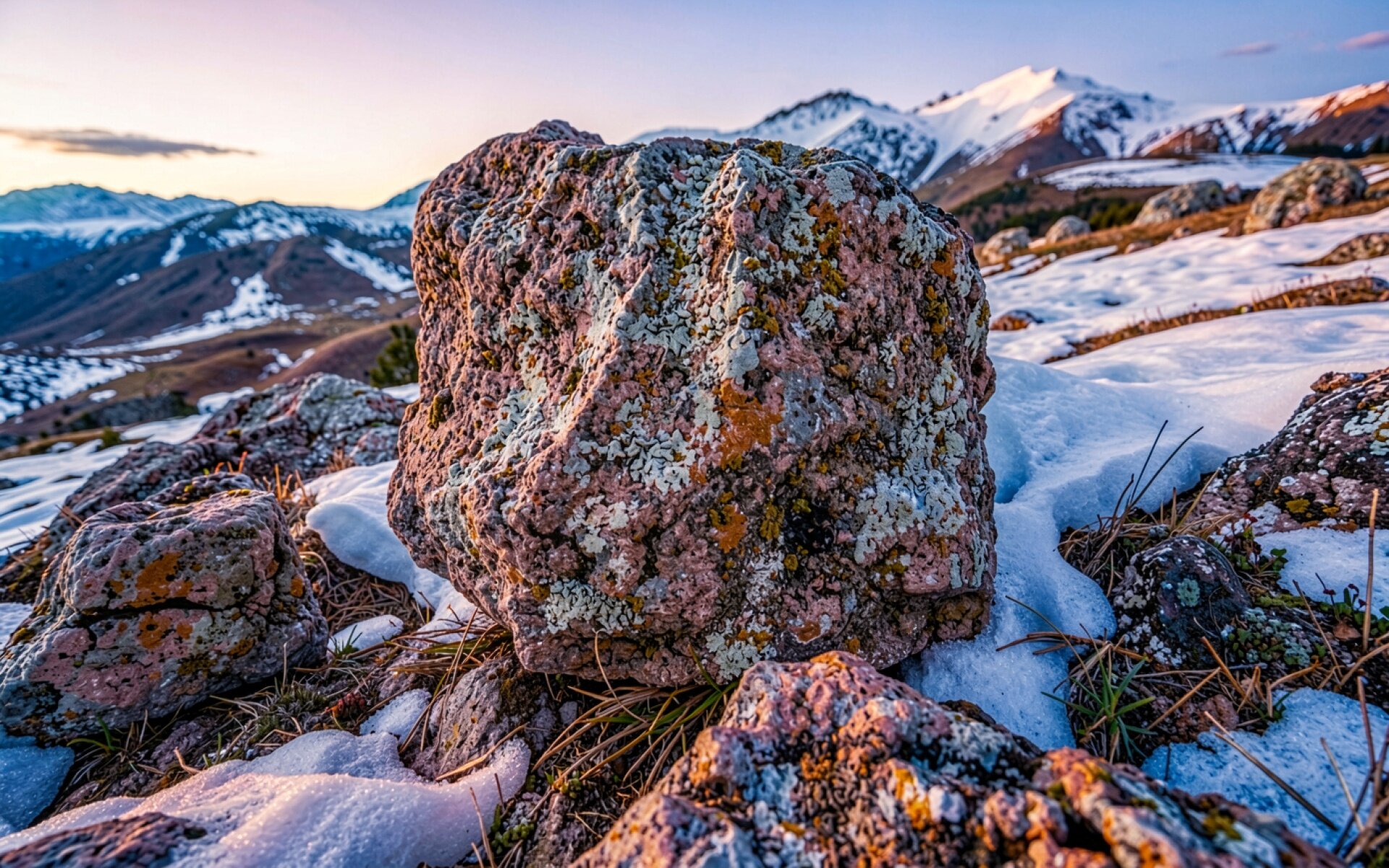 Серый камень в заснеженных горах на закате