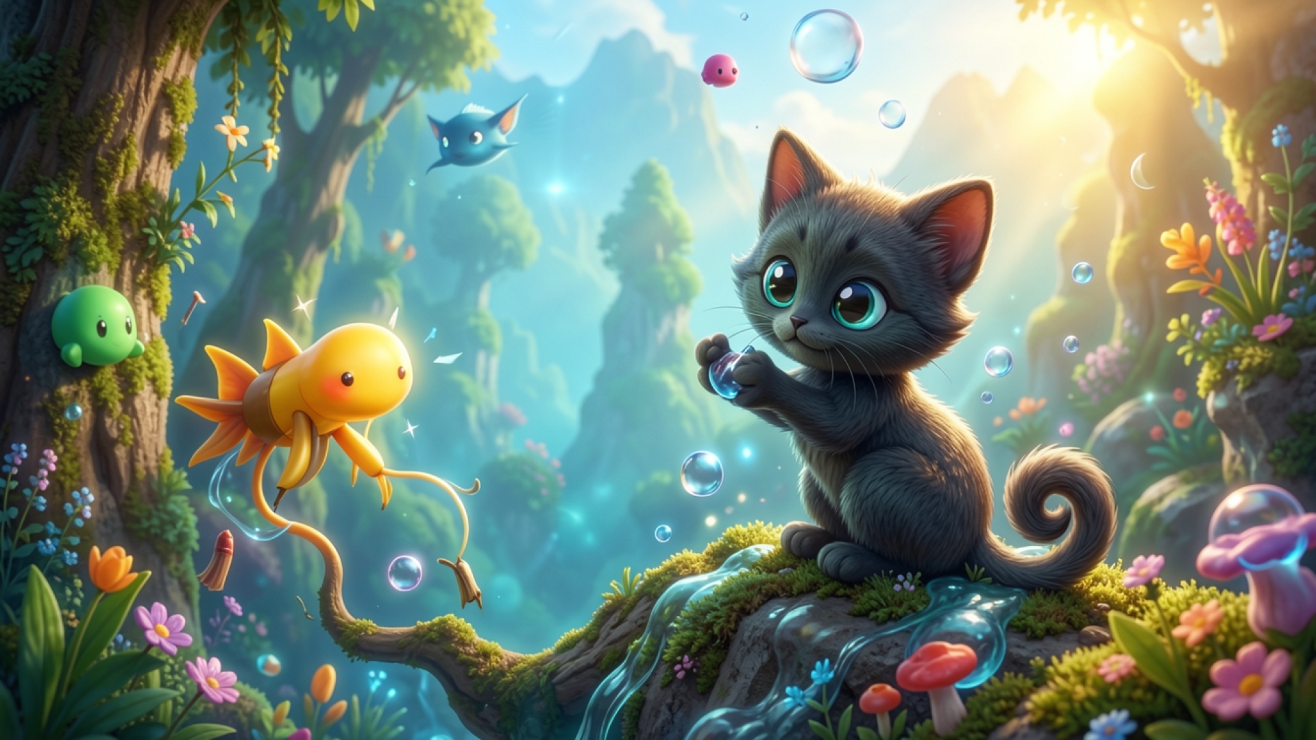 Серый котенок в сказочном лесу с пузырями