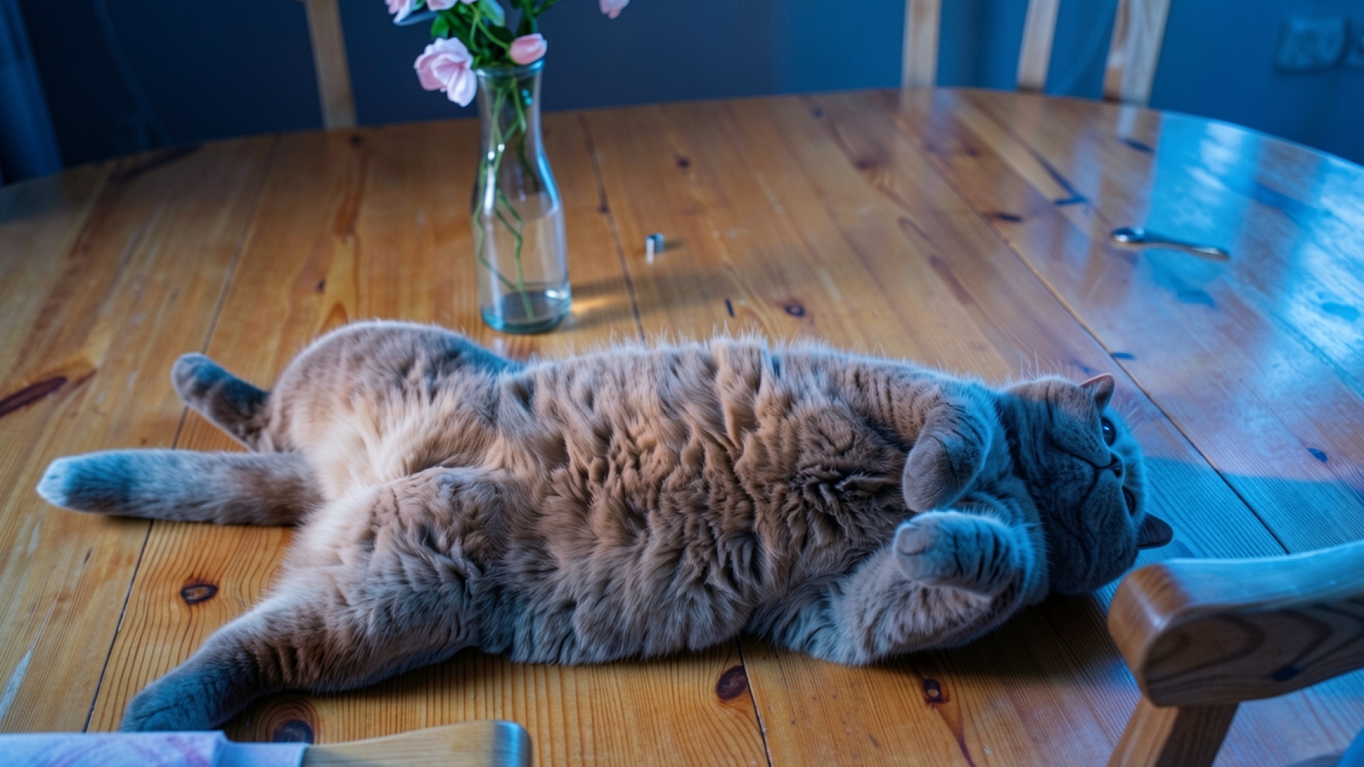 Серый пушистый кот на деревянном столе