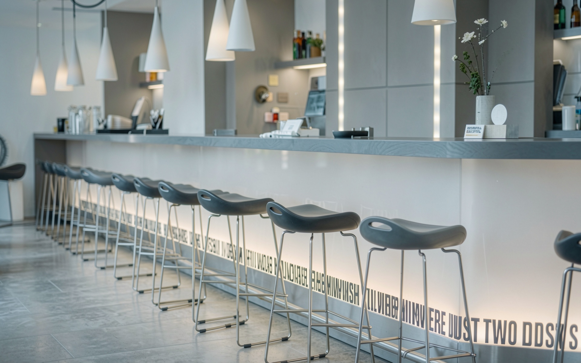 Интерьер современного бара с серыми стульями
