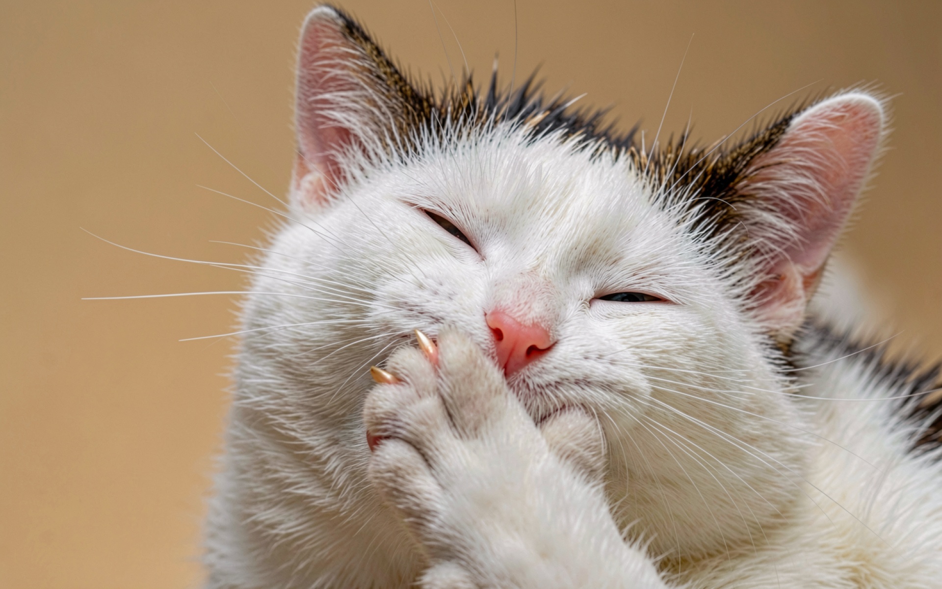 Белый кот с серыми пятнами умывается