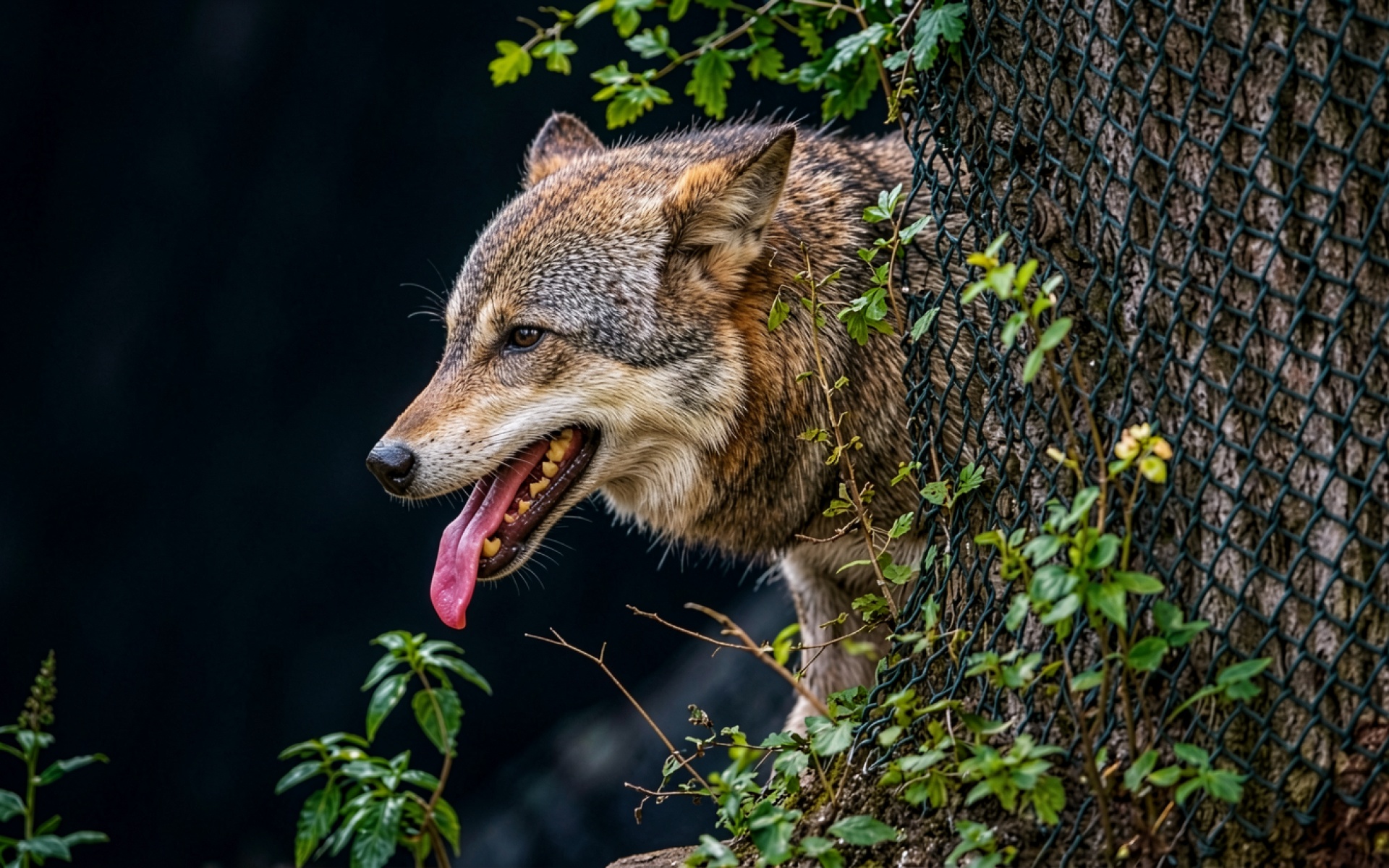 Серый волк за сеткой в лесу