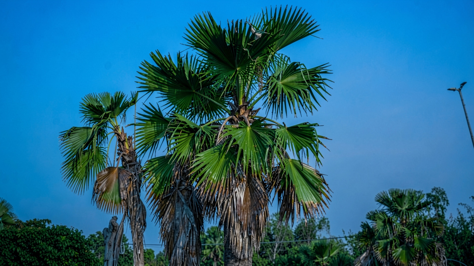 Пальмы веерные на фоне синего неба