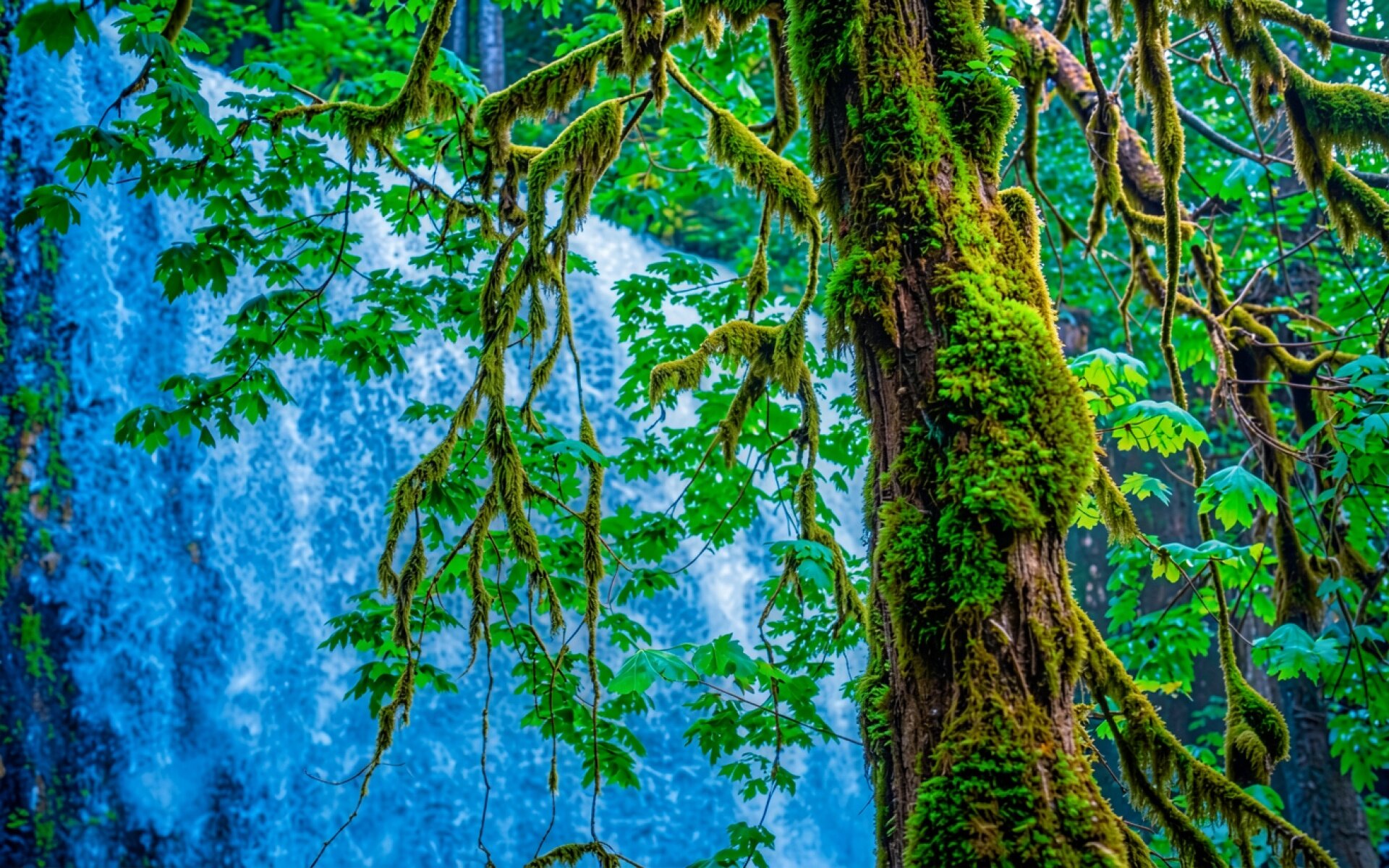 Моховое дерево на фоне синего водопада