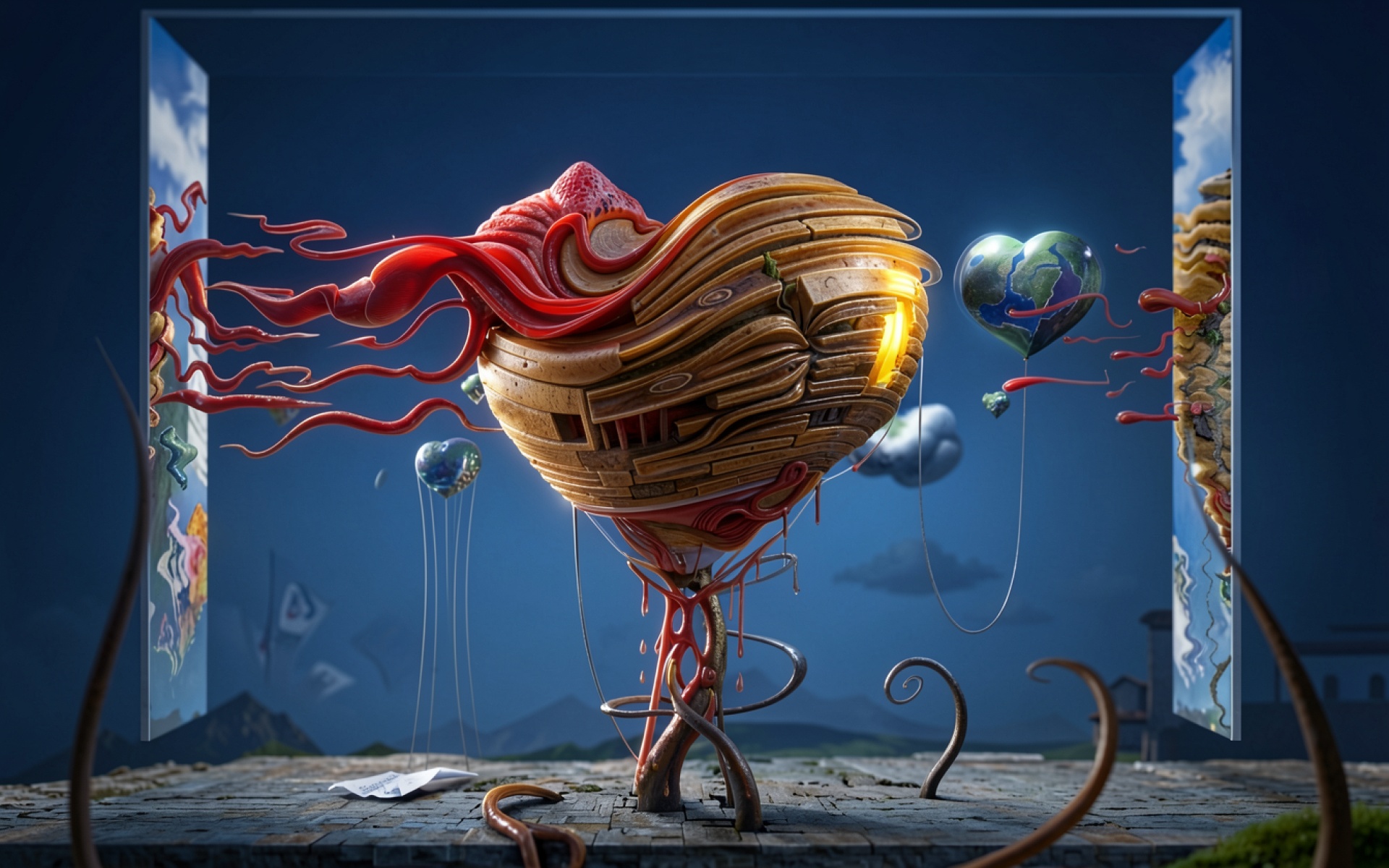 Сюрреалистичное сердце из дерева и плоти синего фона