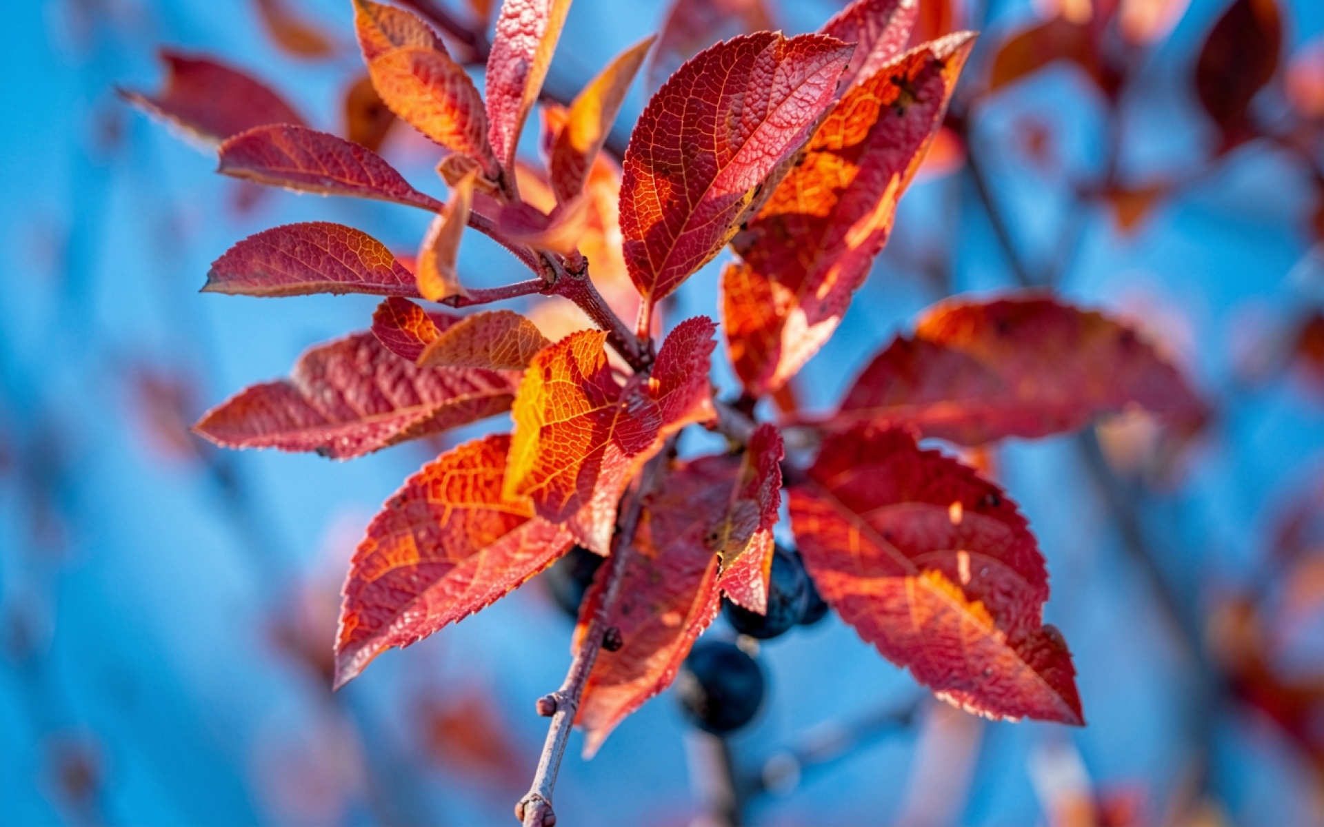 Красные листья дерева на синем фоне