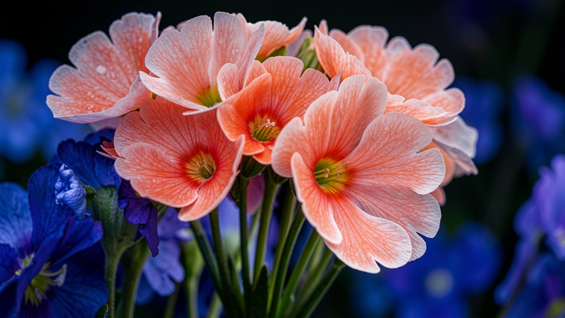 Оранжевые цветы примулы на синем фоне