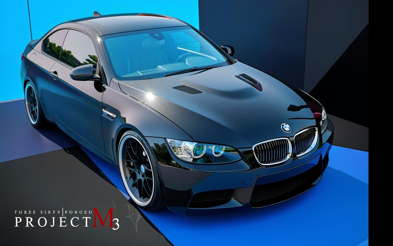 Черный автомобиль BMW M3 в синем студийном интерьере