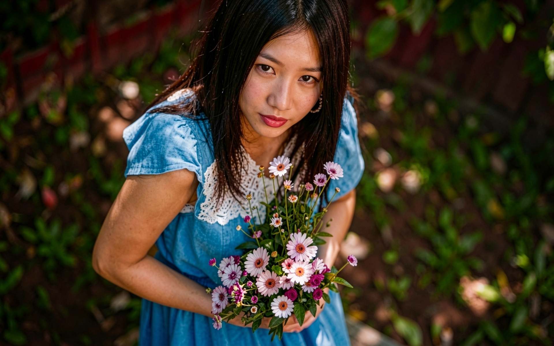 Девушка в синем платье с букетом цветов
