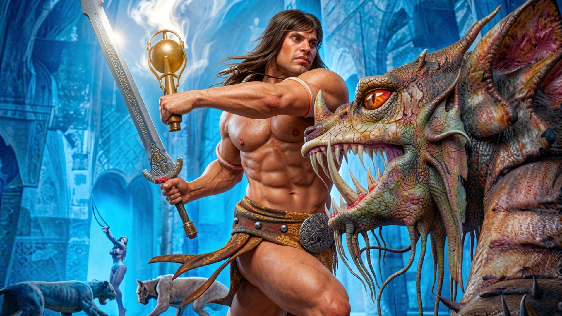 Воин с мечом против дракона в синем замке
