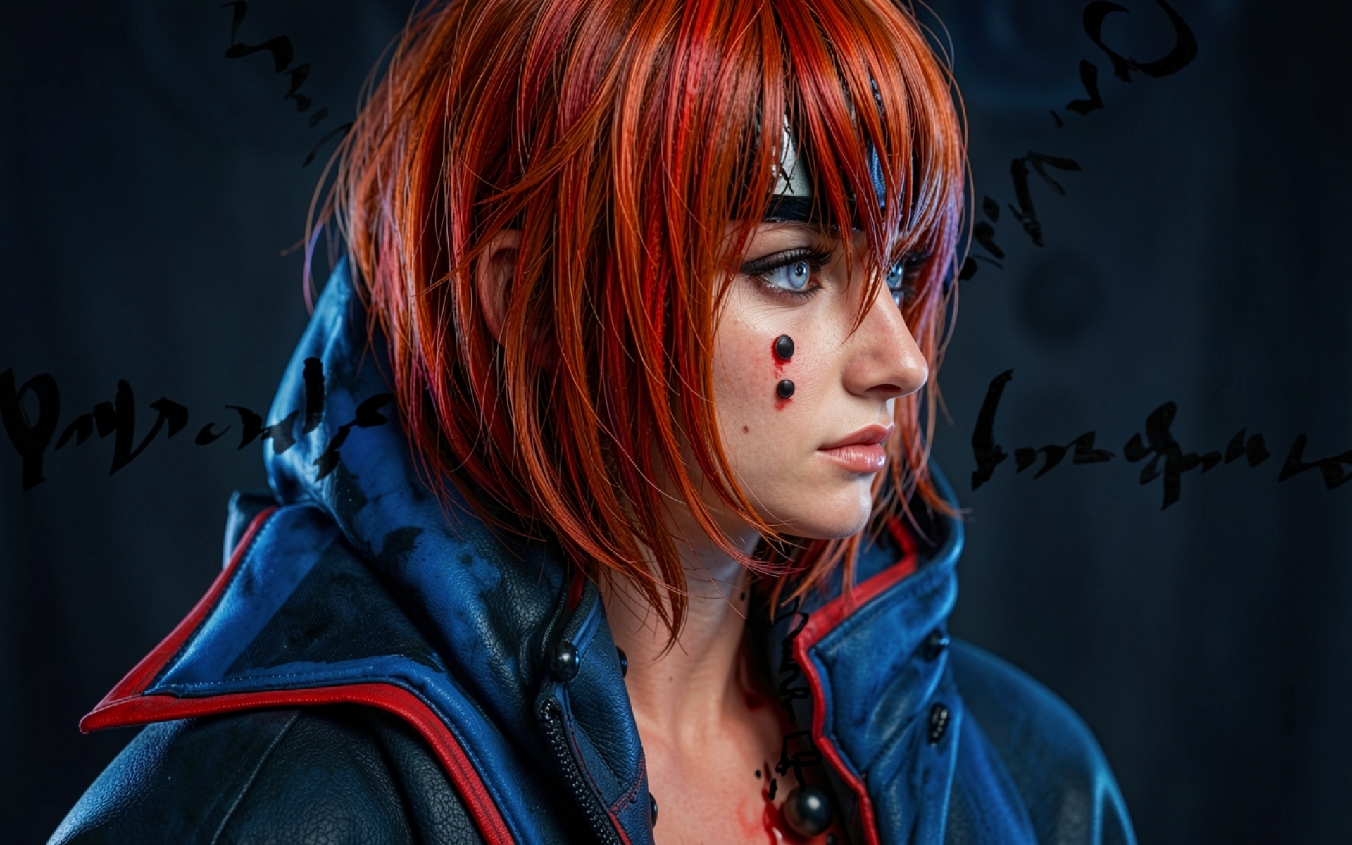 Косплей девушки с красными волосами в синем плаще