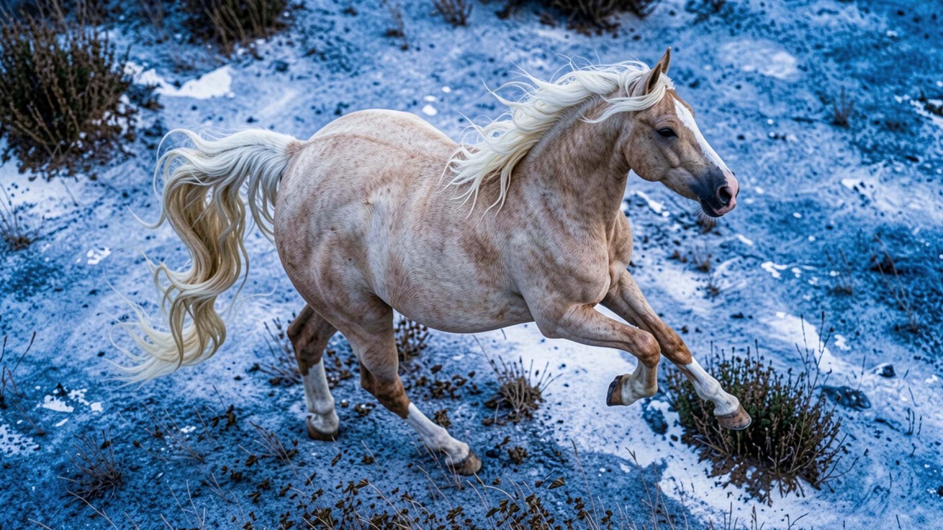Белая лошадь на заснеженном синем поле