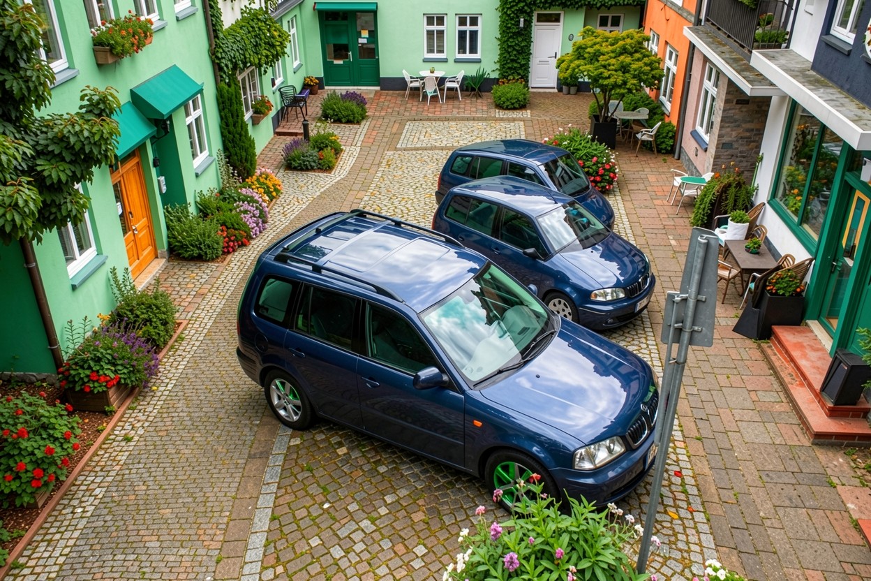 Синие автомобили на мощеной улице города