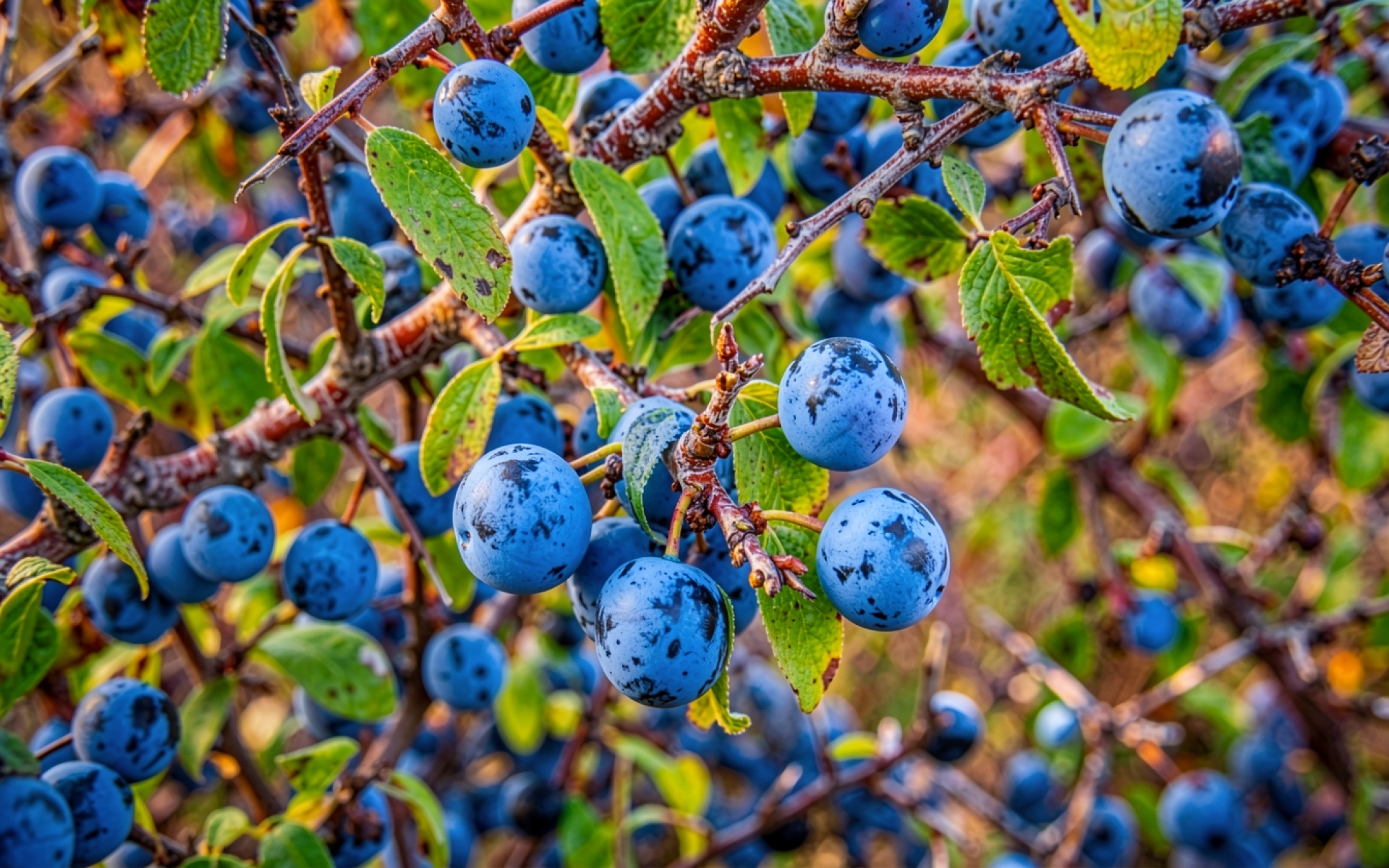 Синие ягоды сливы на ветках куста