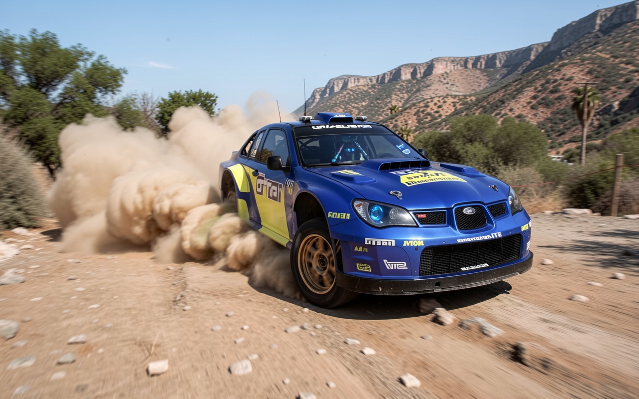Синий раллийный автомобиль Subaru в пыльном карьере