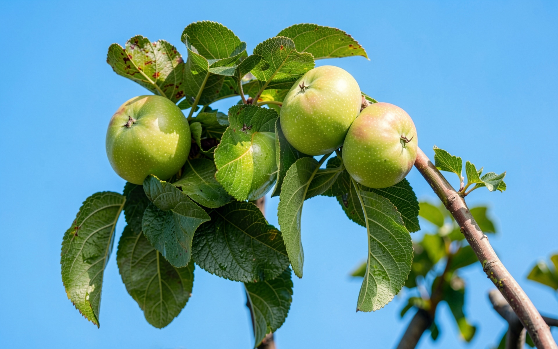 Зеленые яблоки на ветке под синим небом