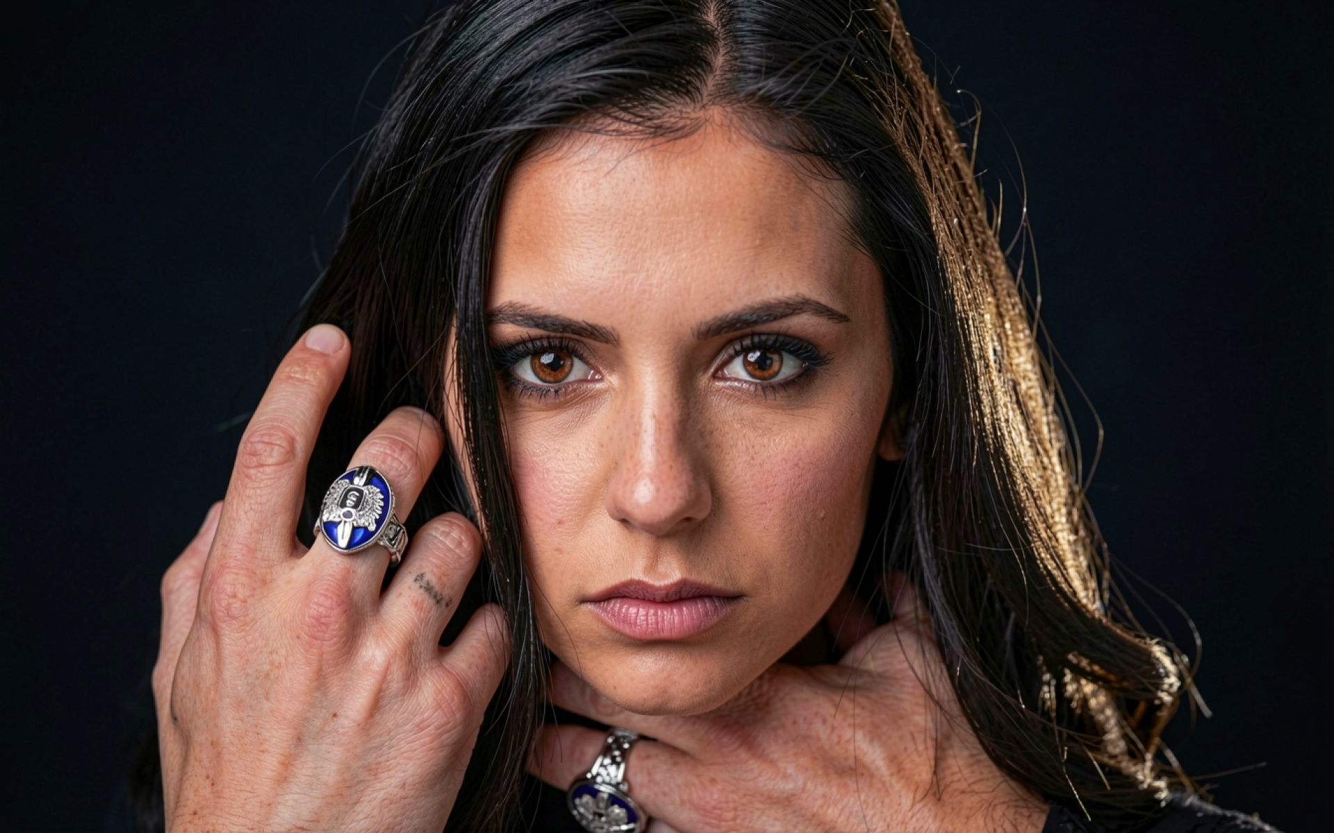 Портрет девушки с синими кольцами темный фон