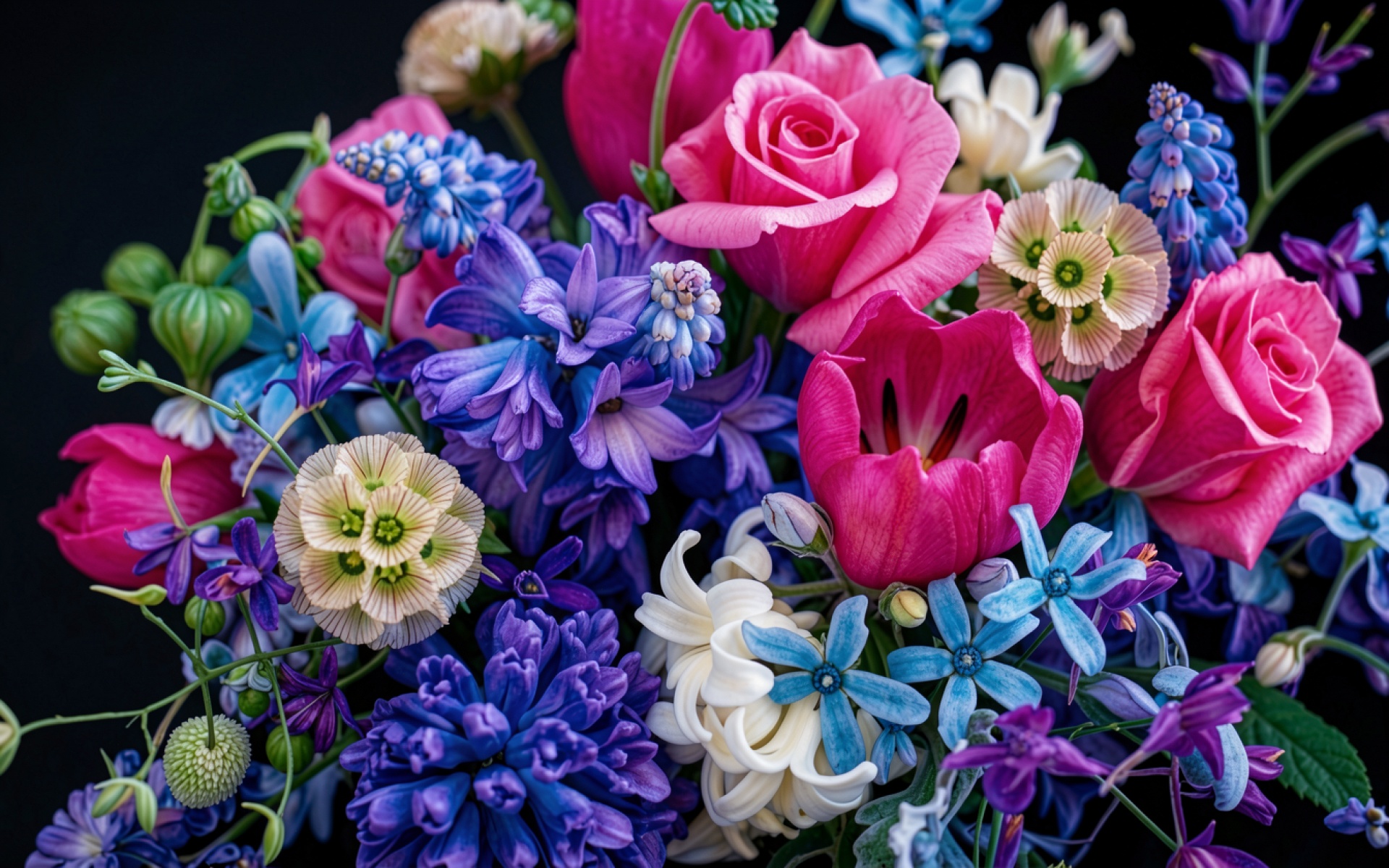 Букет розовых роз и синих гиацинтов на черном фоне