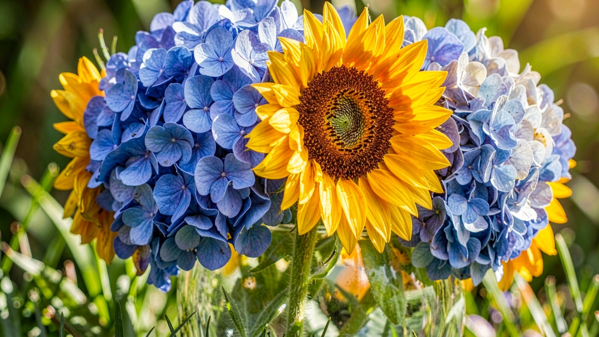 Желтый подсолнух и синяя гортензия в саду